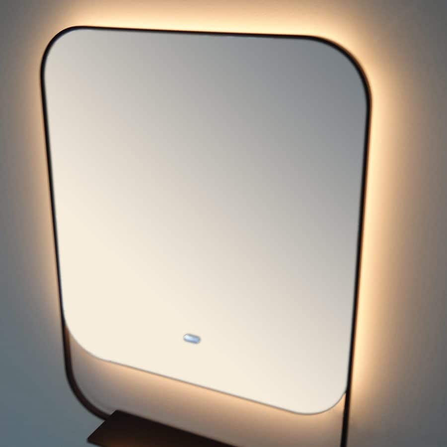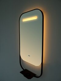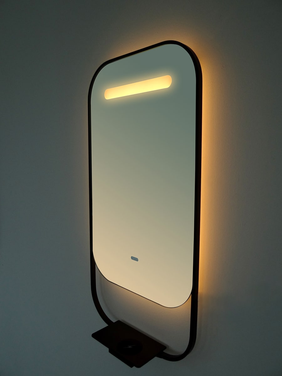 Shelf mirror with 360° lighting , Illuminated ON/OFF touch sensor , 5mm mirror thickness , Safety film backing, Black aluminum frame with integrated shelf, LED temperature color 4000K , 220V, CE, IP44[:]